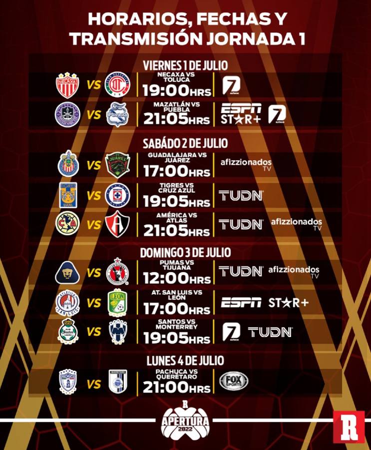Los encargados de inaugurar la nueva campaña serán los Rayos del Necaxa y los Diablos Rojos del Toluca en el Estadio Victoria (19:00 horas, tiempo del centro de México) por Azteca 7; inmediatamente después a las 21:05 Mazatlán FC se medirá a Puebla en el Kraken por Azteca 7, ESPN y Star+´.